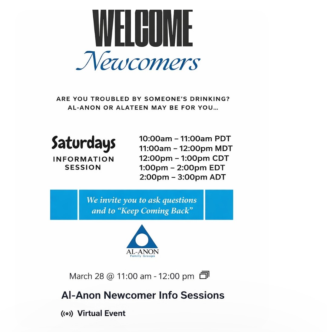 Is Al-Anon for you?  Online sessions to answer newcomer questions are being held every Saturday from 11 AM-noon.  You can stop in anytime during that hour, it is at your convenience to answer any questions you may have.